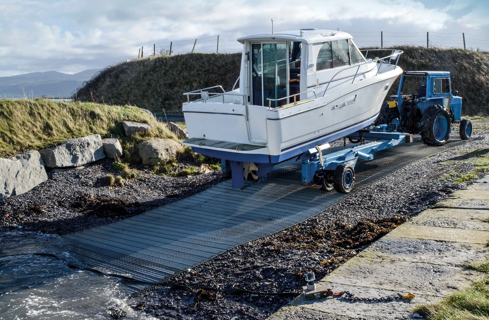 The Boat Ramp Kit facilitates the easy launch and recovery of watercraft and vehicles by providing a stable, non-slip transition surface between land and water.