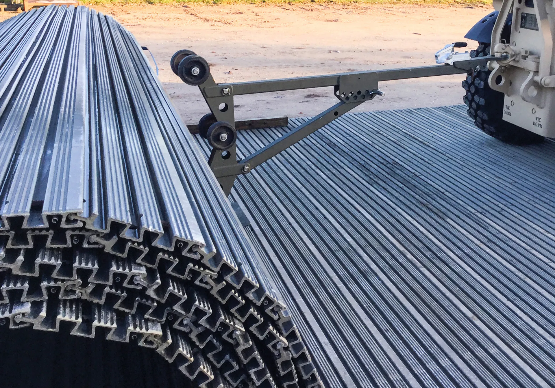 The Pushbar is a galvanised steel device with plastic wheels, designed to roll out and recover up to 131 feet of C40 Trackway® or 98 feet of C90 Trackway® by use of a vehicle with a minimum of 7,716 lb tow capacity, and either: