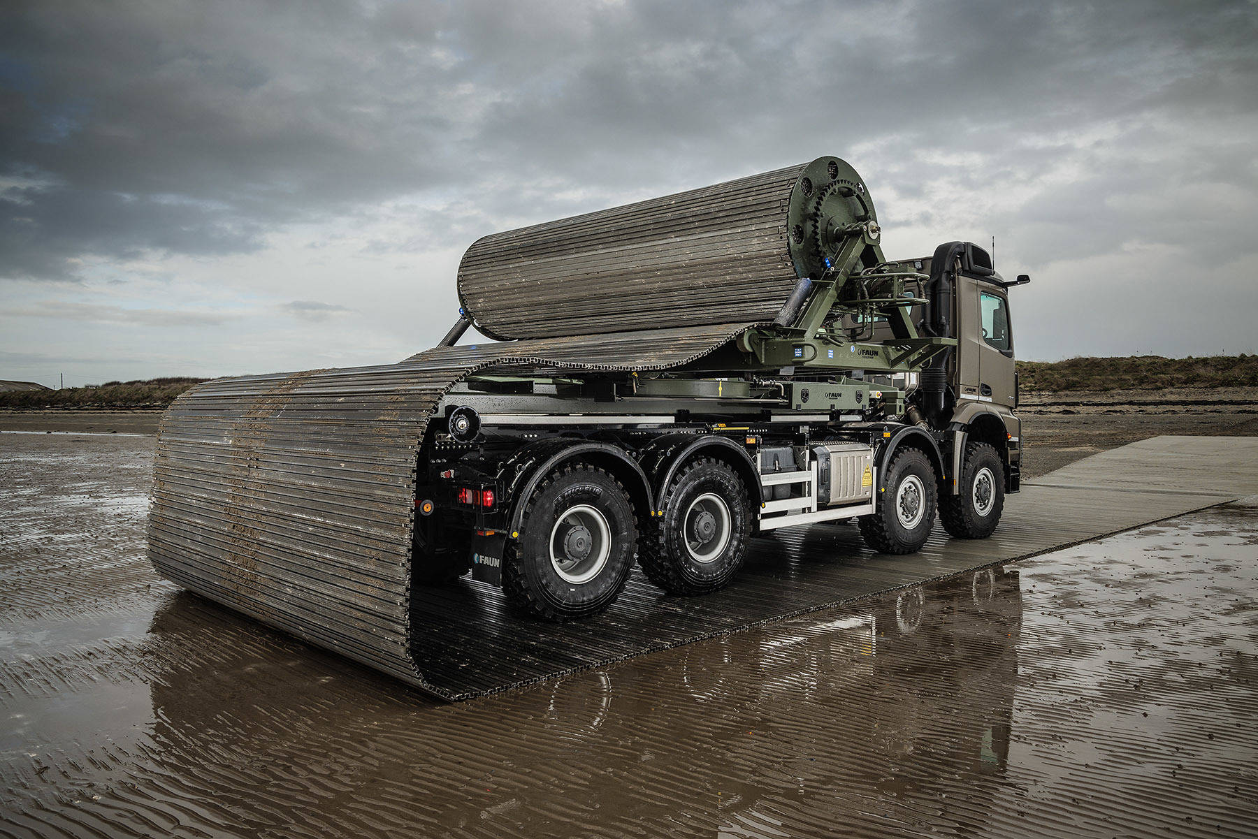 FAUN Trackway® operates from its headquarters on Anglesey and took delivery of its muscular 8×8 Arocs from local Dealer eStar Truck & Van. The vehicle is fitted with hook-loading equipment by Hiab UK and has a mechanised body capable of laying up to 50 metres of interlocking M150 Trackway® aluminium panels over undulating terrain in less than five minutes.